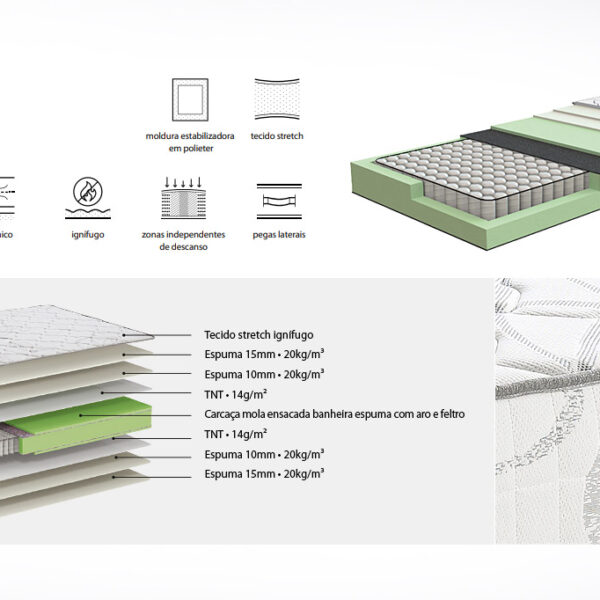 Each wire spring is bagged by TNT (non-woven fabric) and closed by ultrasound. The spring joined by this bag thus becomes independent and better adjusted to wrap around the body. As each spring is individually bagged, they do not touch each other and do not cause noise or feel the movement of the partner, providing greater rest.