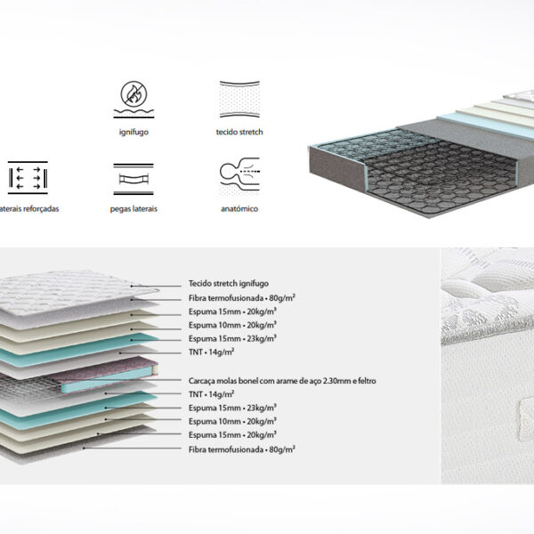 The combination of foams of different densities, on a firm mattress, with bonnel springs, reduces body pressure and improves blood circulation, for a comfortable and restful sleep. Covered with fireproof stretch fabric that makes it flame resistant.