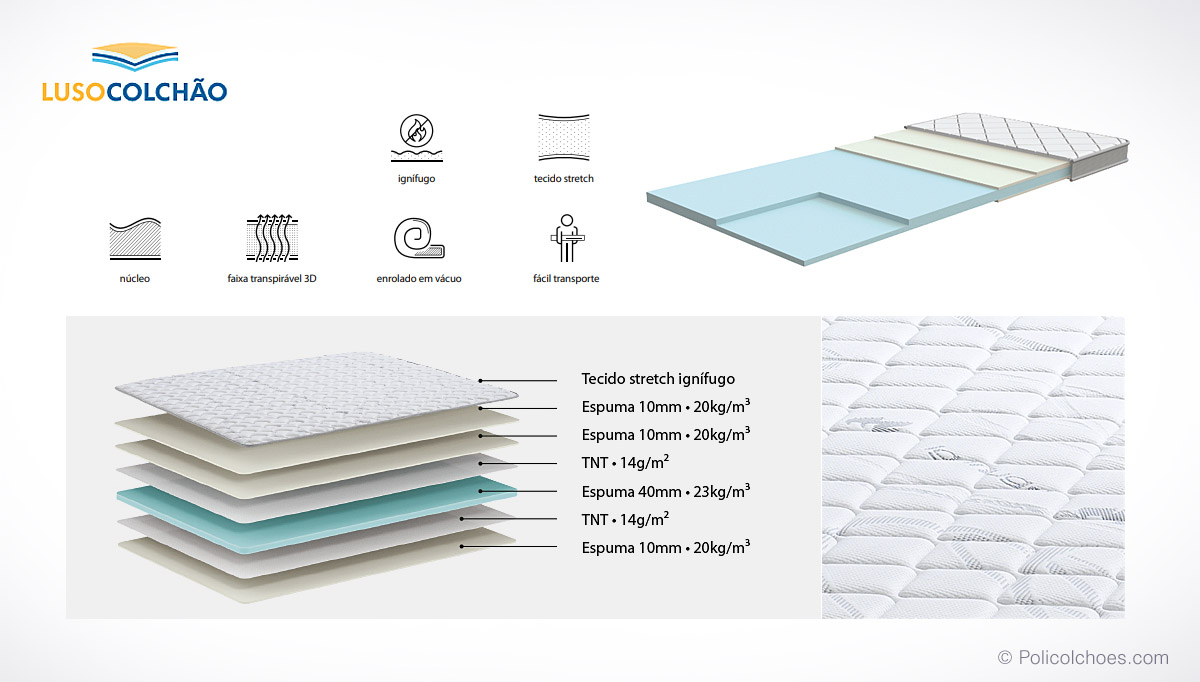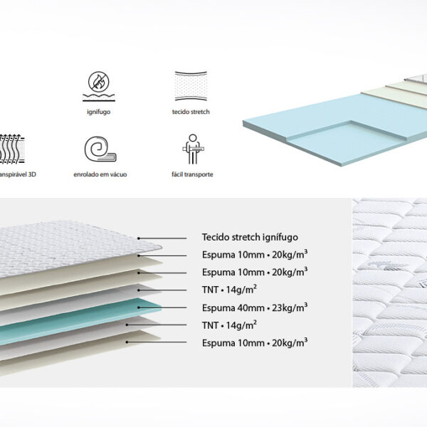 With high-density polyether core, coated with fire-retardant stretch fabric. Ideal for adding comfort to firmer mattresses, reducing body pressure and improving blood circulation, it is also the perfect complement to extend the useful life of the mattress. Supplied rolled up, it can be easily transported.