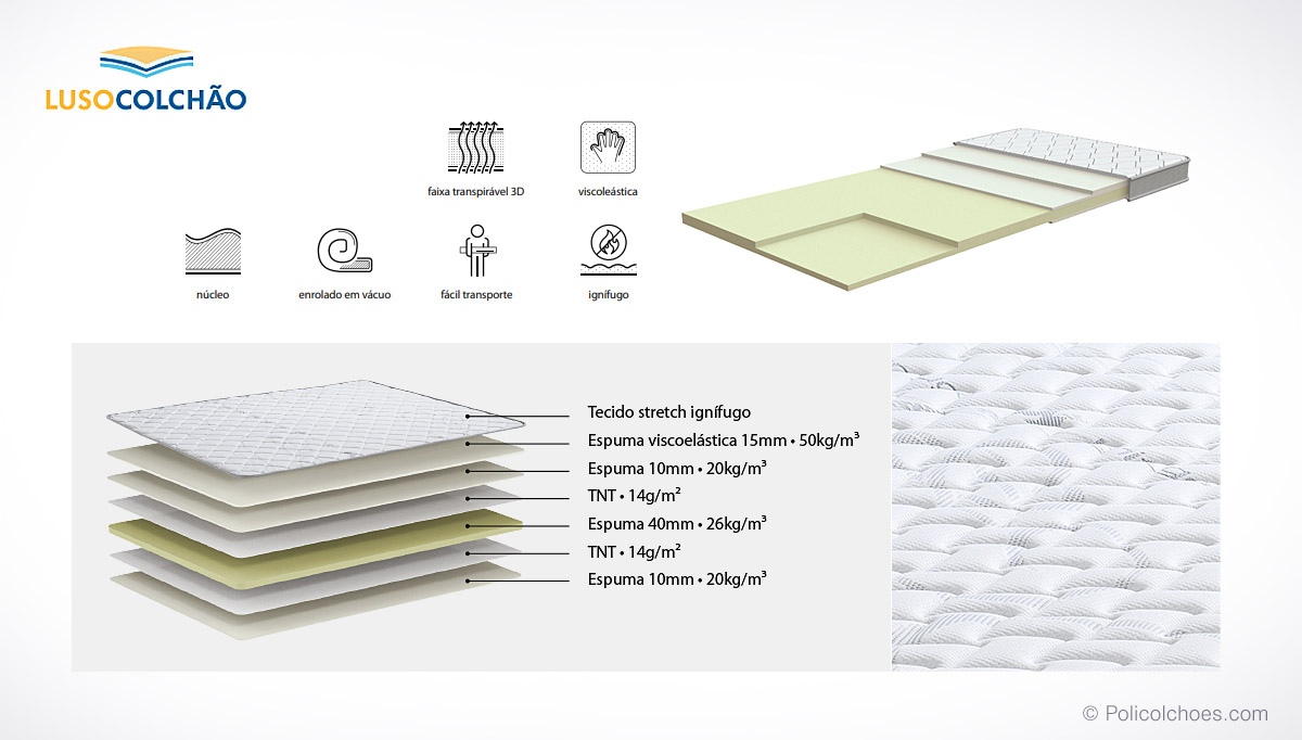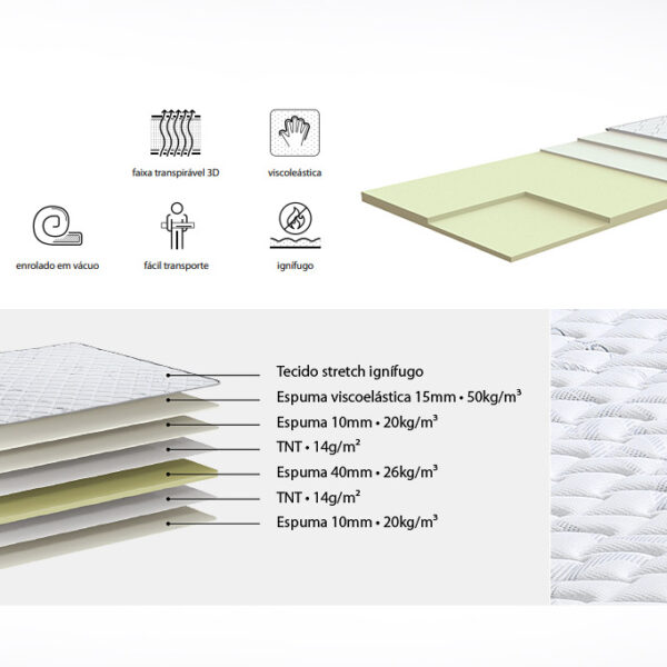 With high-density polyether core, coated with fire-retardant stretch fabric. Ideal for adding comfort to firmer mattresses, reducing body pressure and improving blood circulation, it is also the perfect complement to extend the useful life of the mattress. Supplied rolled up, it can be easily transported.