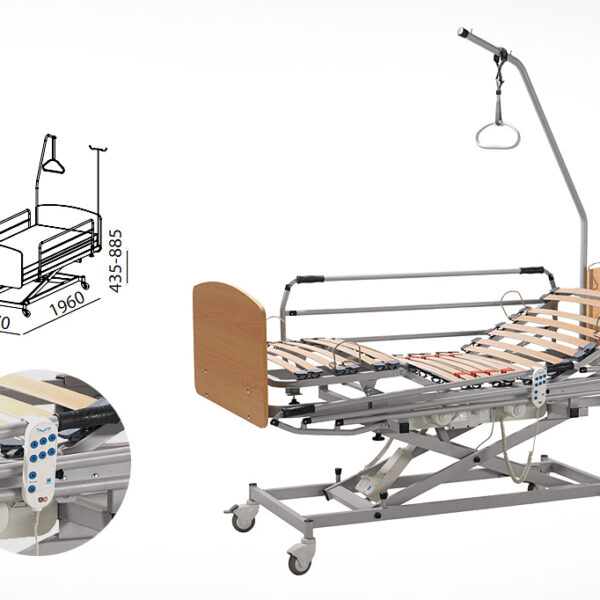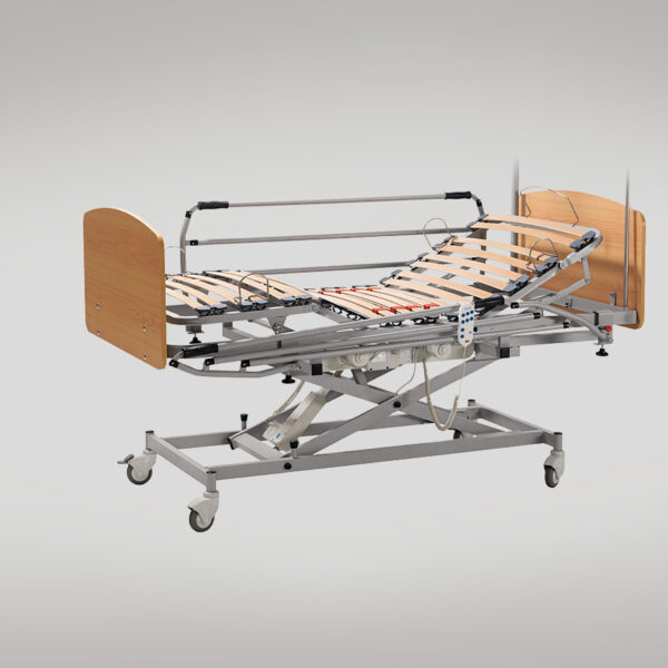 Cama hospitalar com estrado articulado em madeira, estrado de lâminas, suportes, rodas e altura ajustável