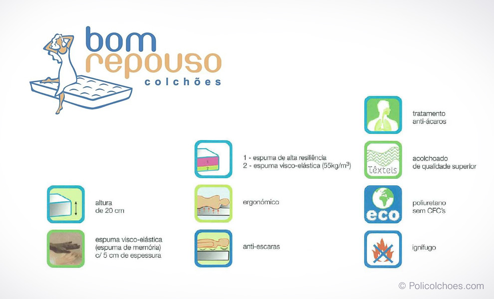 Colchão de viscoelástica e espuma HR, com revestimento acolchoado, antiácaros e ignífugo.