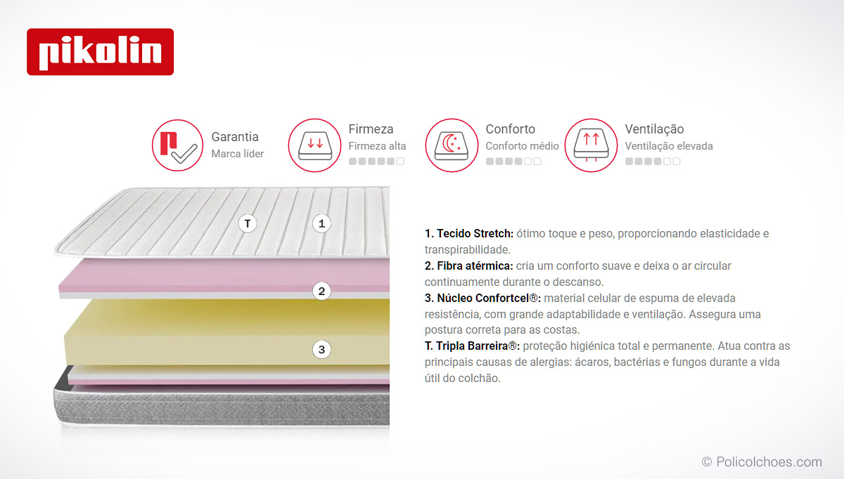 - Tripla Barreira®: proteção higiénica total e permanente. Atua contra as principais causas de alergias: ácaros, bactérias e fungos durante a vida útil do colchão.