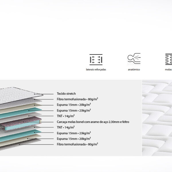 Colchão firme de molas bicónicas e espuma, com 23cm de espessura, ortopédico, anatómico e com revestimento antialérgico.